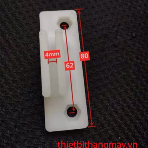 Guốc trượt cửa thang thực phẩm là thiết bị được sử dụng hầu hết cho tất cả các loại thang máy nó được sử dụng hầu hết cho cửa thang máy đặc biệt là thang thực phẩm, thang thức ăn, thang hàng… Nó được làm bằng nhựa nguyên chất hoặc nhựa dẻo. Cơ chế hoạt động của nó vô cùng đơn giản mỗi cửa sẽ sử dụng 4 chiếc guốc cửa thang máy được gắn vào cánh cửa của thang máy. Khi cánh cửa đóng ra mở vào cửa sẽ được trượt trên siu cửa bằng các guốc cửa giúp cửa không bị trượt ra khỏi vị trí rãnh cửa giúp cửa đóng ra mở vào 1 cách êm ái!
